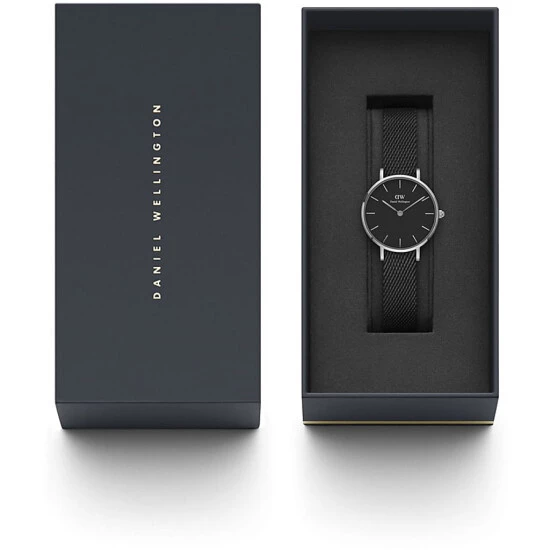 Nur time clock von frau Daniel Wellington classic collection of petite. Modell mit gehäusen aus stahl durchmesser von 28 mm und eine dicke von 6 mm und quadranten der schwarzen farbe mit silbernem rande. Das band e ‚austauschbare netzbody in schwarz und breite 12 mm. Clock gekennzeichnet von japanischem quarz-uhrwerk und dem widerstand von all’acqua 3 atm. Die referenz ist dw00100246