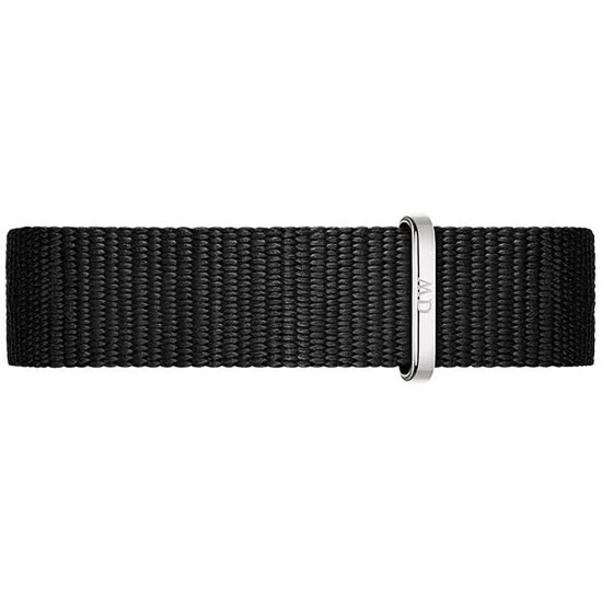 Daniel Wellington Uni Strap Aus der Petite Collection. Schwarzes Leinwandband mit silberner Schnalle. Die Breite beträgt: 14mm. Kompatibel mit 32mm Lautsprechern. Die Referenz ist Dw00200179