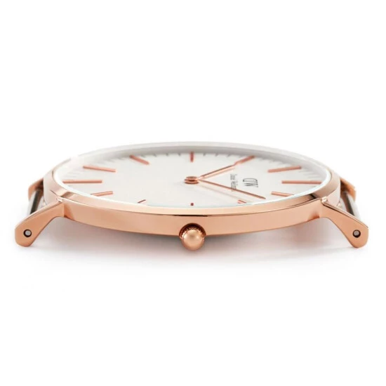 Armbandfarbe Weiß Mehrfarbig Blau Uhrwerk Quarz Zifferblattfarbe Weiß Geschlecht Herrenuhren Anzeige Analog Gehäusematerial Edelstahl (rosevergoldet) Armbandmaterial Textil Armbandanstoßbreite 20 mm Durchmesser 40 mm Höhe 6 mm Gewicht 41 Gramm Funktionen – rosegoldene Zeiger – rosegoldene Indices Wasserdichte 3 ATM Glas Mineralglas Kaliber Citizen Miyota Gehäuseboden Edelstahl Armbandschließe Dornschließe (Edelstahl) Lieferumfang Original Verpackung Bedienungsanleitung Gehäusefarbe Rose
