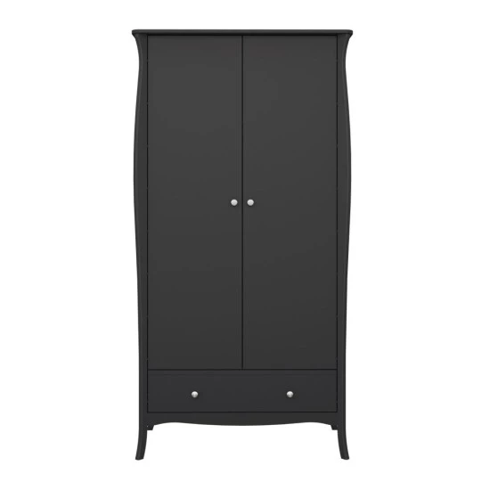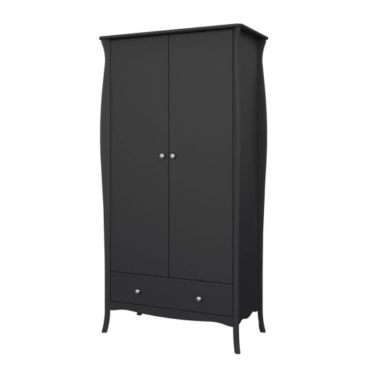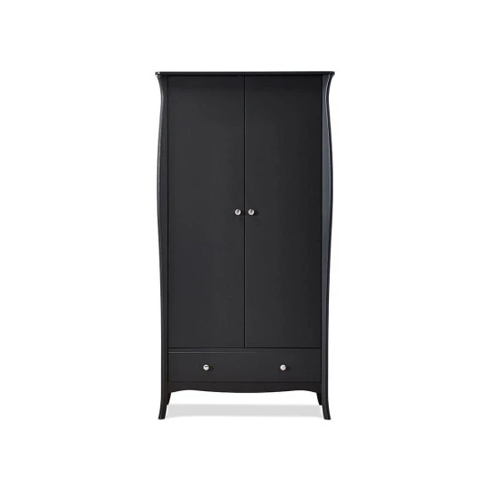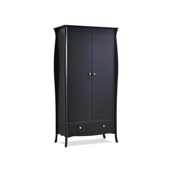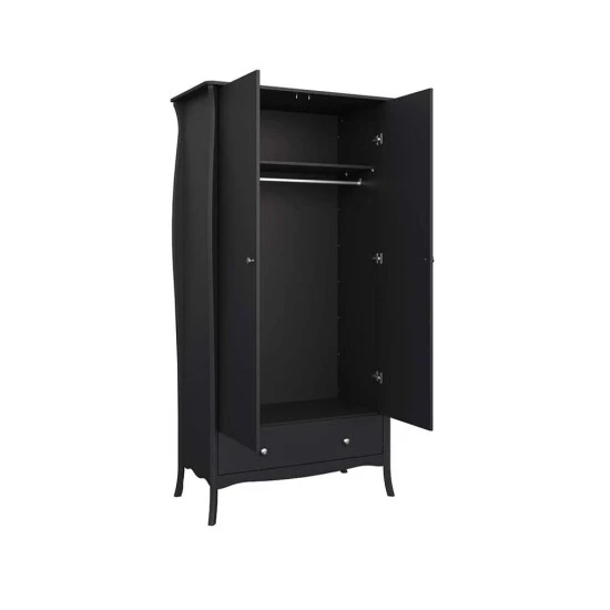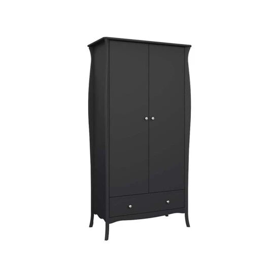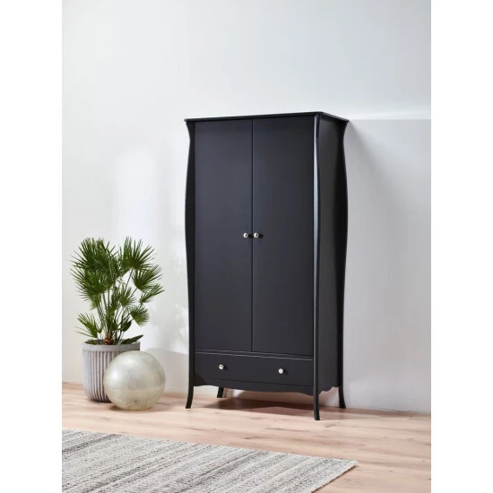 Steens Kleiderschrank Baroque 104 schwarz, 192 x 99 cm In schicker Optik erfreut der Kleiderschrank Baroque von Steens. Mit seiner leicht geschwungenen Form wird er zum Hingucker im Schlafbereich und setzt romantische Akzente. Erhältlich in mehreren Farben, lässt sich der Schrank ideal auf die vorhandene Einrichtung abstimmen. Beschläge, Scharniere und Kleiderstangen aus Metall komplettieren die schöne Gestaltung. Produktinformationen: Maße: Gesamthöhe: 192 cm Gesamtbreite: 99 cm Gesamttiefe: 50 cm Material: Material: MDF Farbe: schwarz Lieferung: Ware wird zerlegt geliefert. Markeninformation: Die Steens Group wächst seit 50 Jahren stetig weiter. Es wird nur hochwertiges Holz aus den skandinavischen Wäldern genutzt