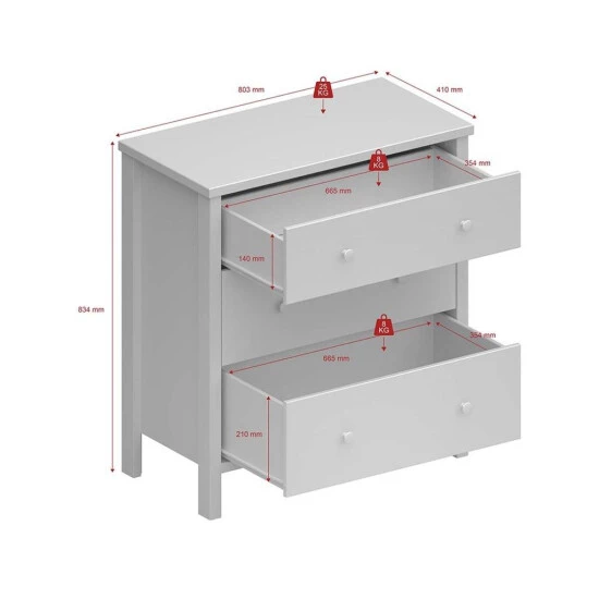Produkte der Serie: 2x Nachtkommode, 4x Kommode, Sideboard, 2x Tisch, Kleiderschrank, 2x Bücherregal, Schuhkommode, Konsolentisch und 2x Kinderbett