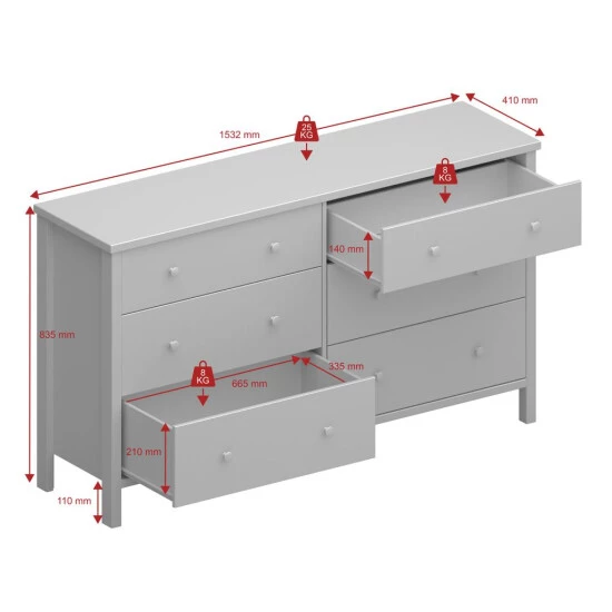 Produkte der Serie: 2x Nachtkommode, 4x Kommode, Sideboard, 2x Tisch, Kleiderschrank, 2x Bücherregal, Schuhkommode, Konsolentisch und 2x Kinderbett